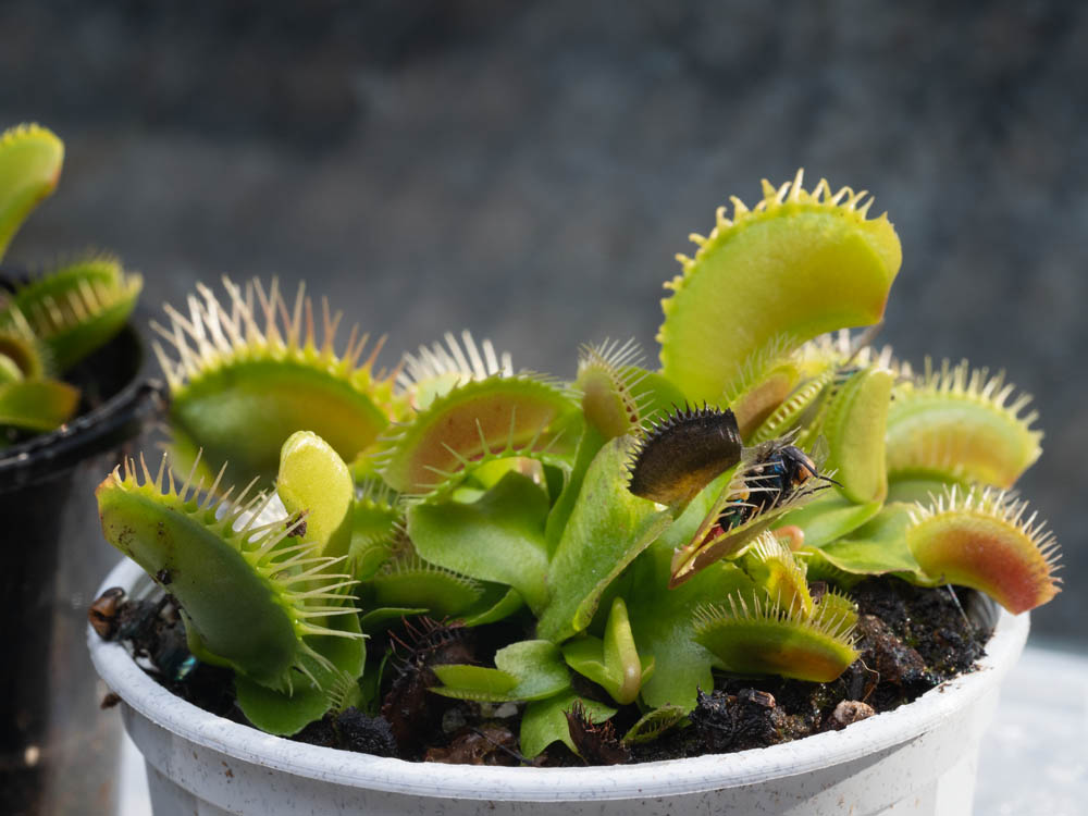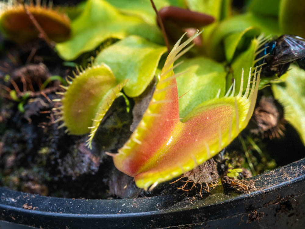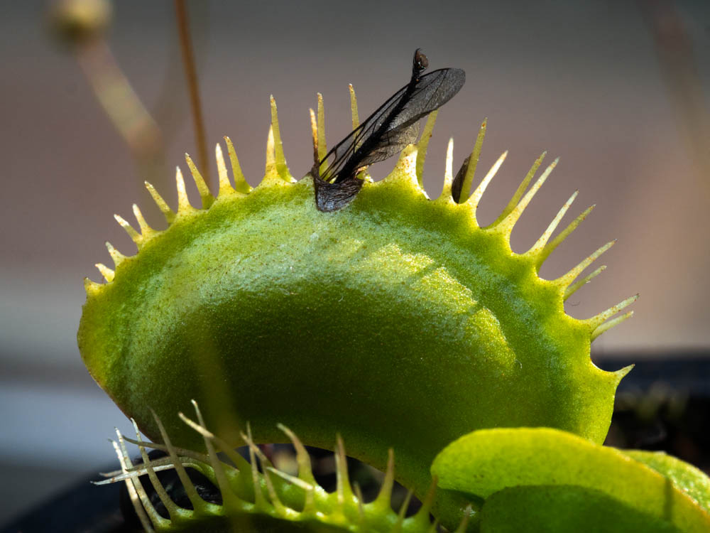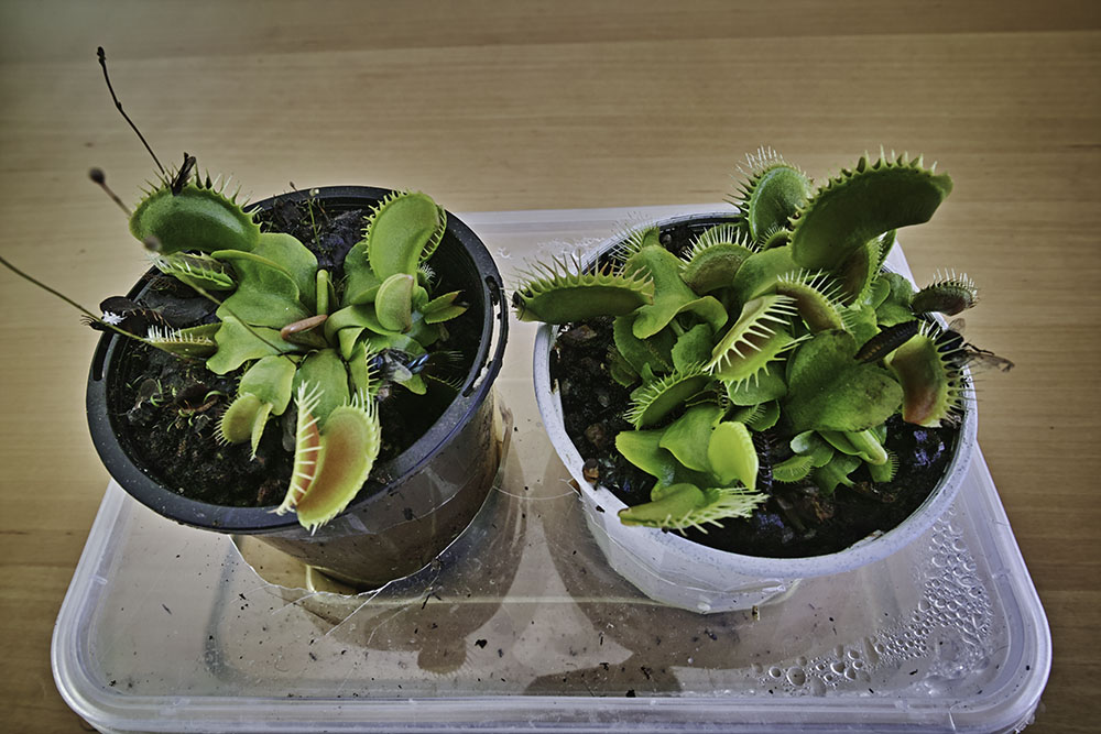 Two months later and the Venus Fly traps are still alive. A most remarkable occurrence. My thumbs are getting greener. The Venus Fly traps are native to North Caroliner, USA and while I have not ventured to that neck of the woods I am guessing their natural habitat is damp as these plants like to be sitting in a shallow tray of water. The water absolutely has to be pure water, ie no tap water as chemicals in tap water will kill the plants. I hacked a takeaway container keeping the lid on to reduce evaporation. It works well, just not very elegant and I saw some mosquito larvae swimming in the water.